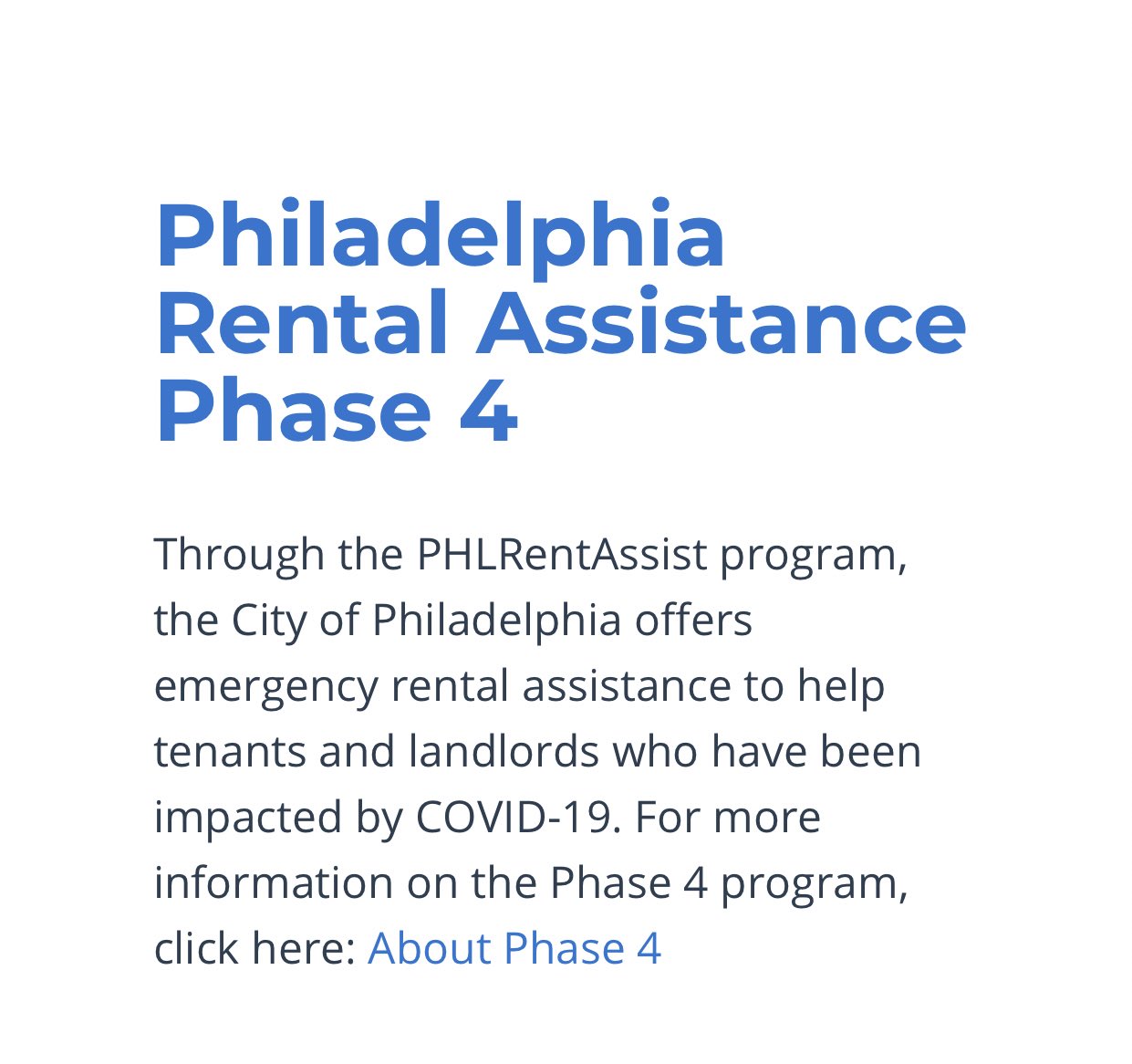 PHILADELPHIA PA-April 5 2021-Today the City of Philadelphia announces PHLRentAssist Phase 4-the Citys COVID-19 Emergency Rental and Utility Assistance Program. Philadelphia Rental Assistance Phase 4 Phase 4 of the Covid-19 Emergency Rental Assistance is no longer accepting applications due to a reduction in federal funding for programs like ours. Phase 4 Landlords Rental Assistance Training Video Phase 4 Maximums No Longer in Effect as of June 30 2021 Phase 4 no longer has any maximum.